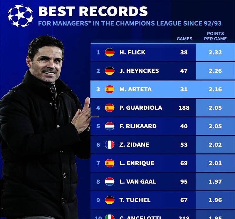 阿尔特塔欧冠场均得分力压瓜迪奥拉,领跑前三遗憾未夺冠